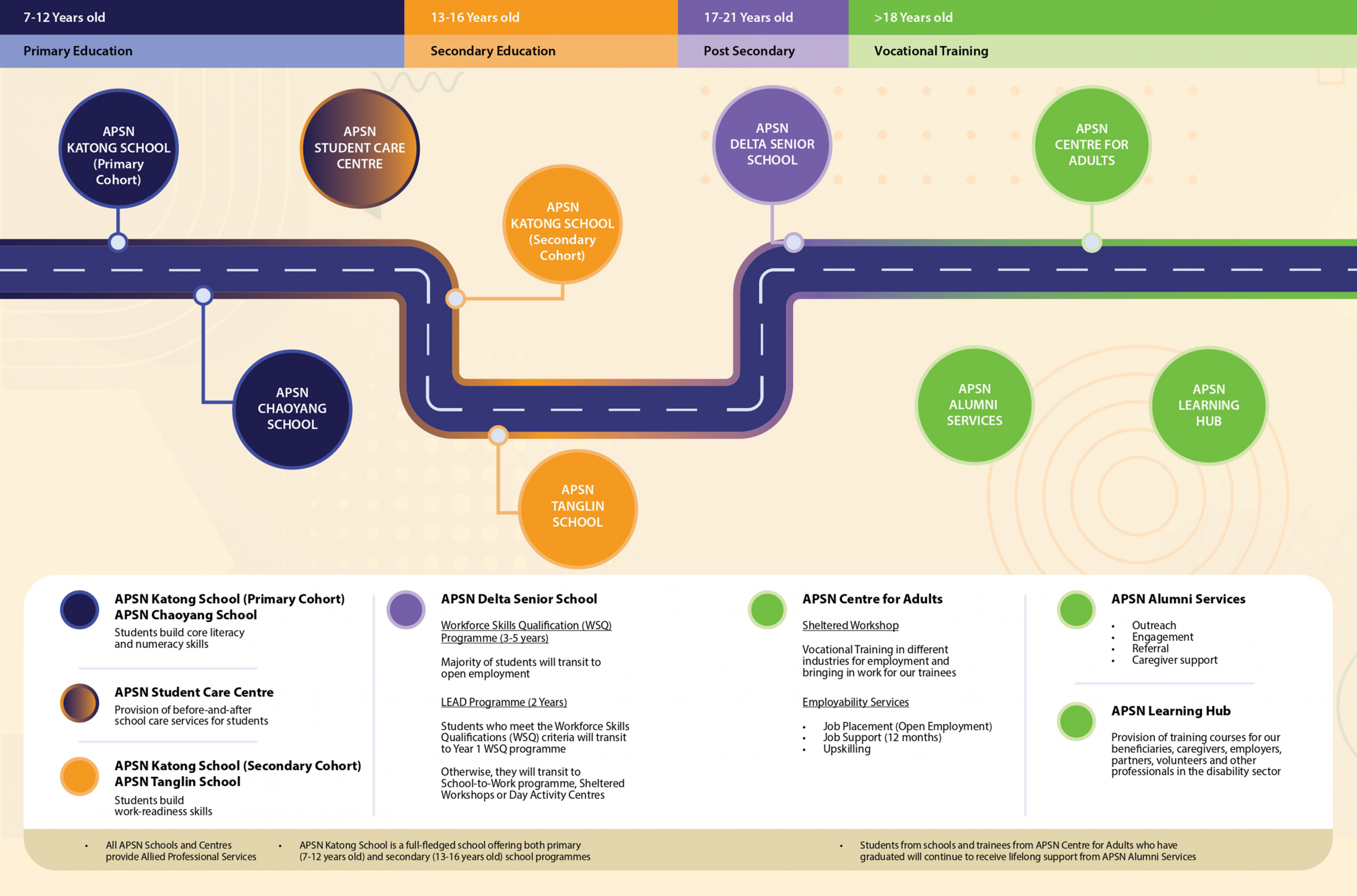 We currently operate four Special Education (SPED) Schools (Chaoyang School, Katong School, Tanglin School and Delta Senior School) for students between the ages of 7 and 21, APSN Student Care Centre for children from 7 to 18 years old, APSN Centre for Adults for persons from 18 years and older, and APSN Learning Hub for working professionals and other stakeholders.