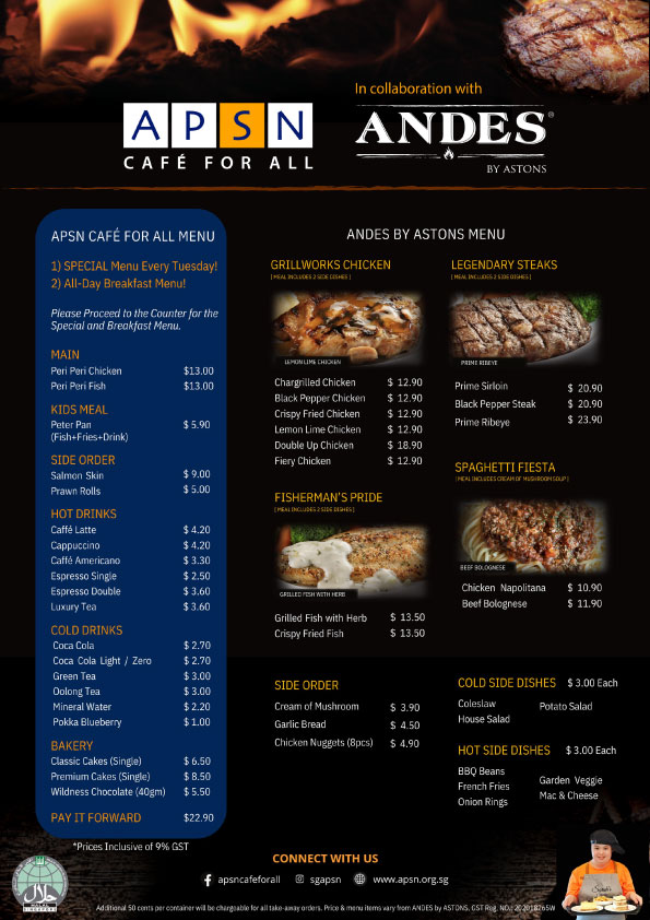 APSN Café for All, Catering Kitchen and Bakery awarded halal certification from MUIS. “APSN Café For All in collaboration with ASTONS” is renamed “APSN Café For All in collaboration with Andes by ASTONS”.